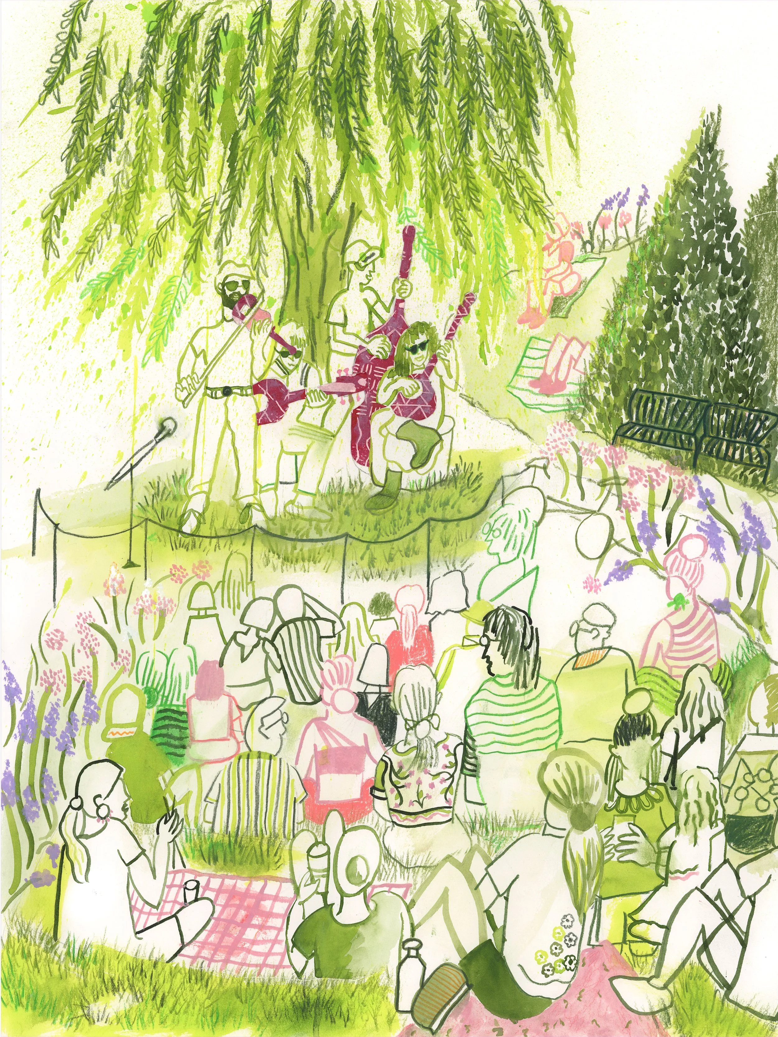 A woman with dark hair in a high ponytail, wearing a patterned blouse, sitting on a large rock in a lush green park, sketching in a notebook. There are trees and various green plants around her.